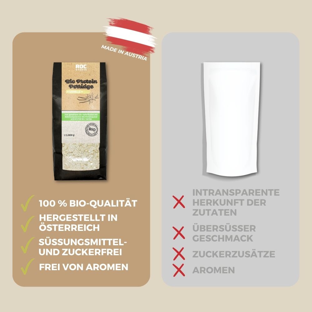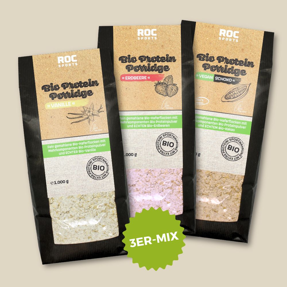 Normale Haferflocken haben je nach Sorte einen Proteingehalt zwischen 10 und 13 g je 100 g. Der Bio Protein Porridge von ROC-Sports hat mit knapp 23 g somit einen doppelt so hohen Proteingehalt als herkömmliche Haferflocken. Mehr Protein bedeutet somit ich mehr Beitrag zu einer rascheren Regeneration.