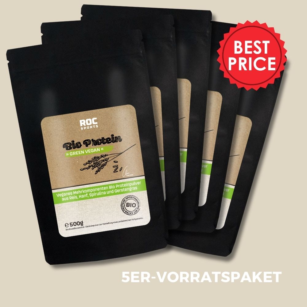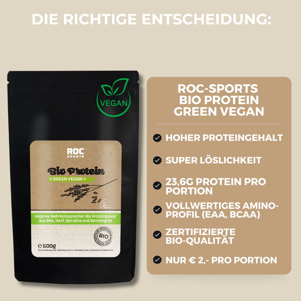 Die Basis sollte immer eine bedarfsgerechte Ernährung sein. Wenn diese passt, dann kannst Du Deinen Proteinbedarf natürlich noch mit dem veganen ROC-Sports Bio Proteinpulver aufbessern.