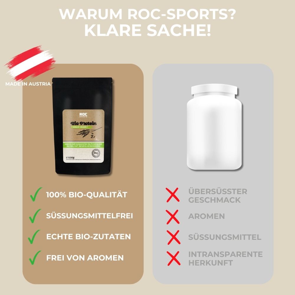 Wenn Du damit Deinen täglichen Proteinbedarf nicht deckst, so kannst Du das ROC-Sports Bio Proteinpulver als Ergänzung verwenden.