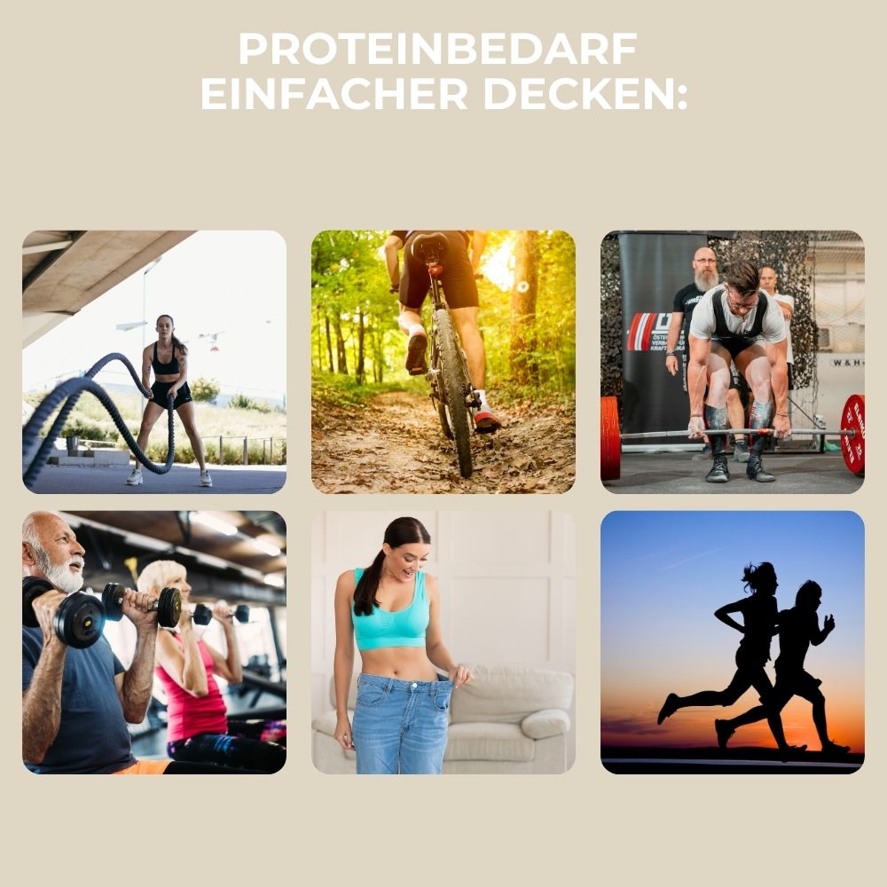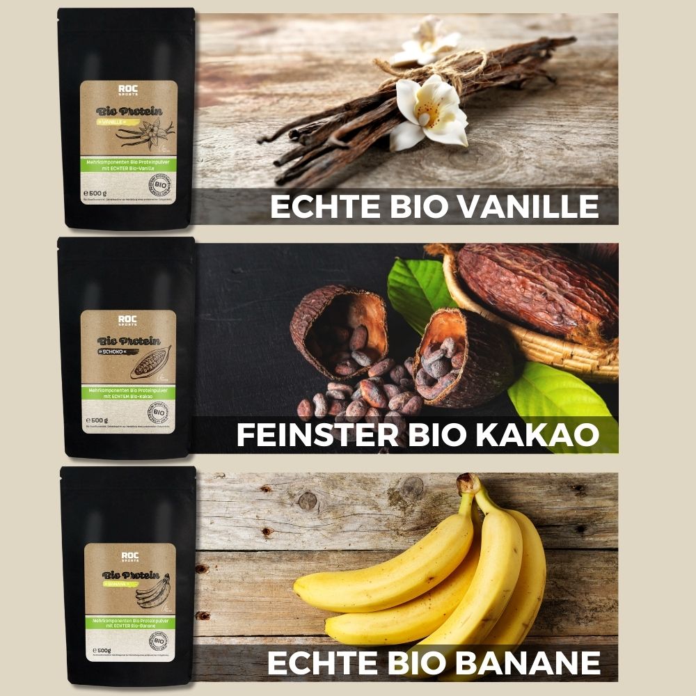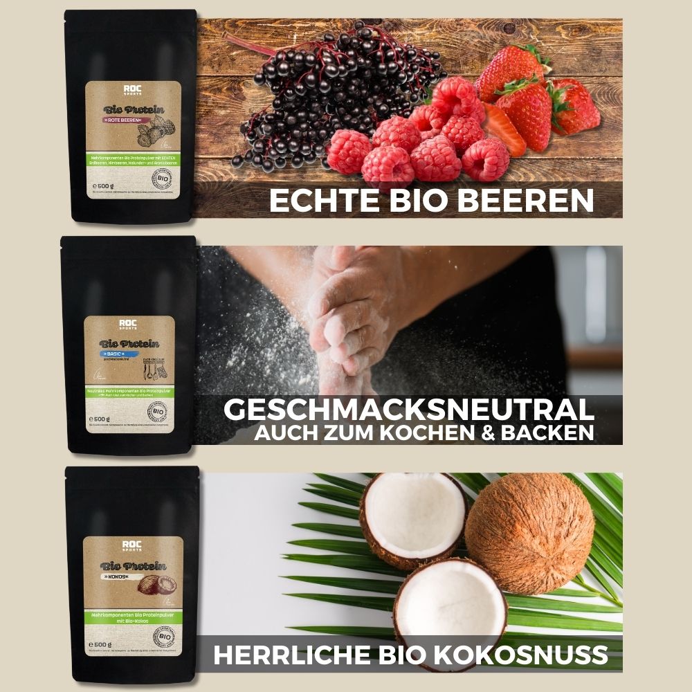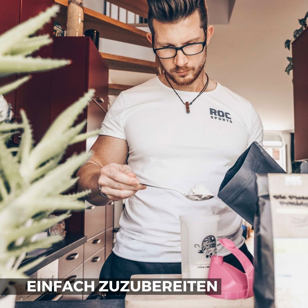 Wenn Du damit Deinen täglichen Proteinbedarf nicht deckst, so kannst Du das ROC-Sports Bio Proteinpulver als Ergänzung verwenden.